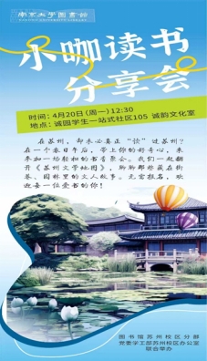 4月20日中午,作为南京大学“全民阅读周”系列活动之一,由图书馆苏州校区分部与党委学工部苏州校区办公室联合举办的“小咖读书分享会”在诚园学生一站式社区105诚韵文化室举行。本次活动以“在文字里,遇见不一样的苏州”为主题,来自各院系的读书爱好者齐聚一堂,在春日的午后共赴一场小而温暖的书香聚会。