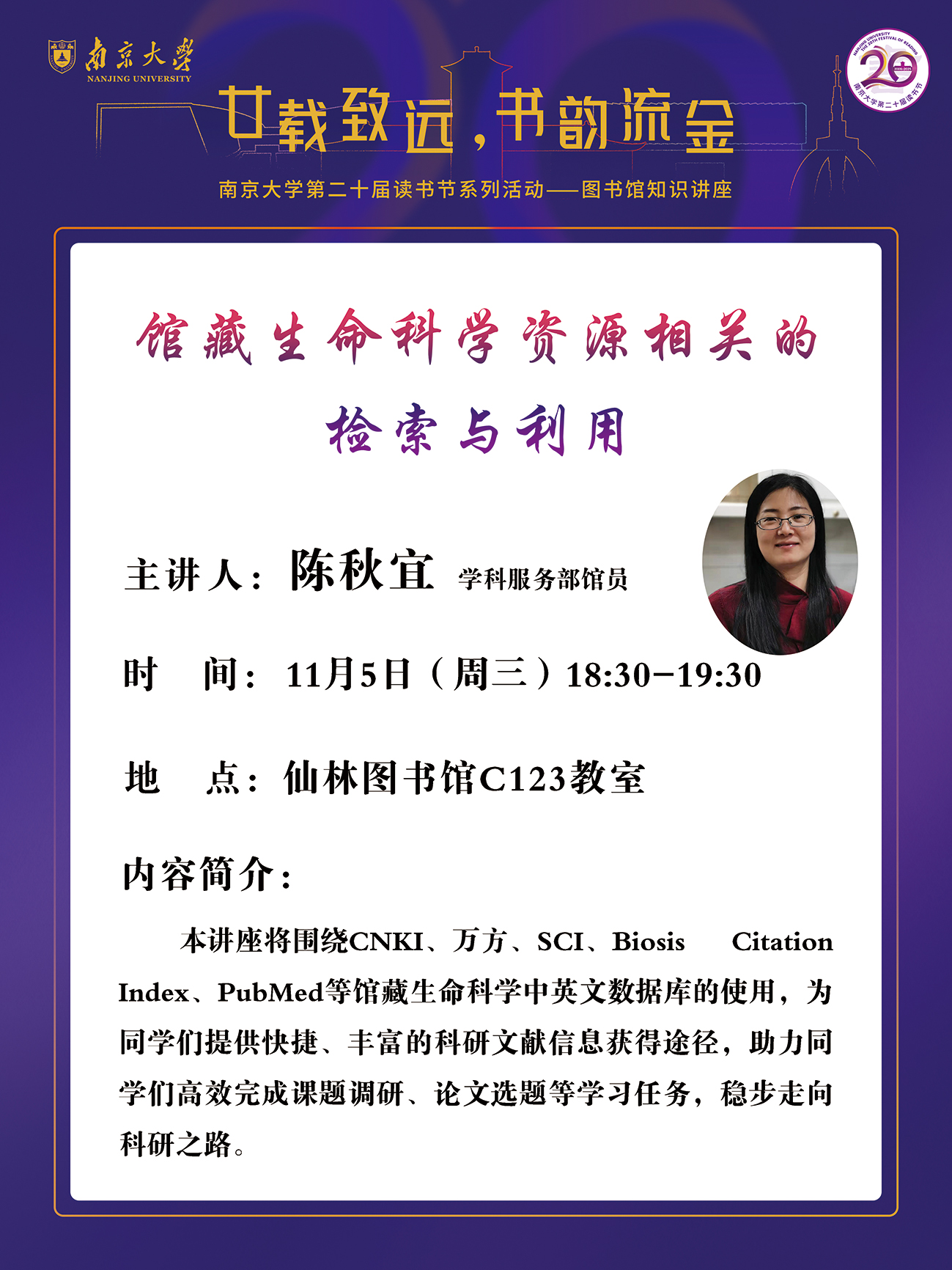 【讲座信息】11月5日图书馆知识讲座之馆藏生命科学资源相关的检索与利用