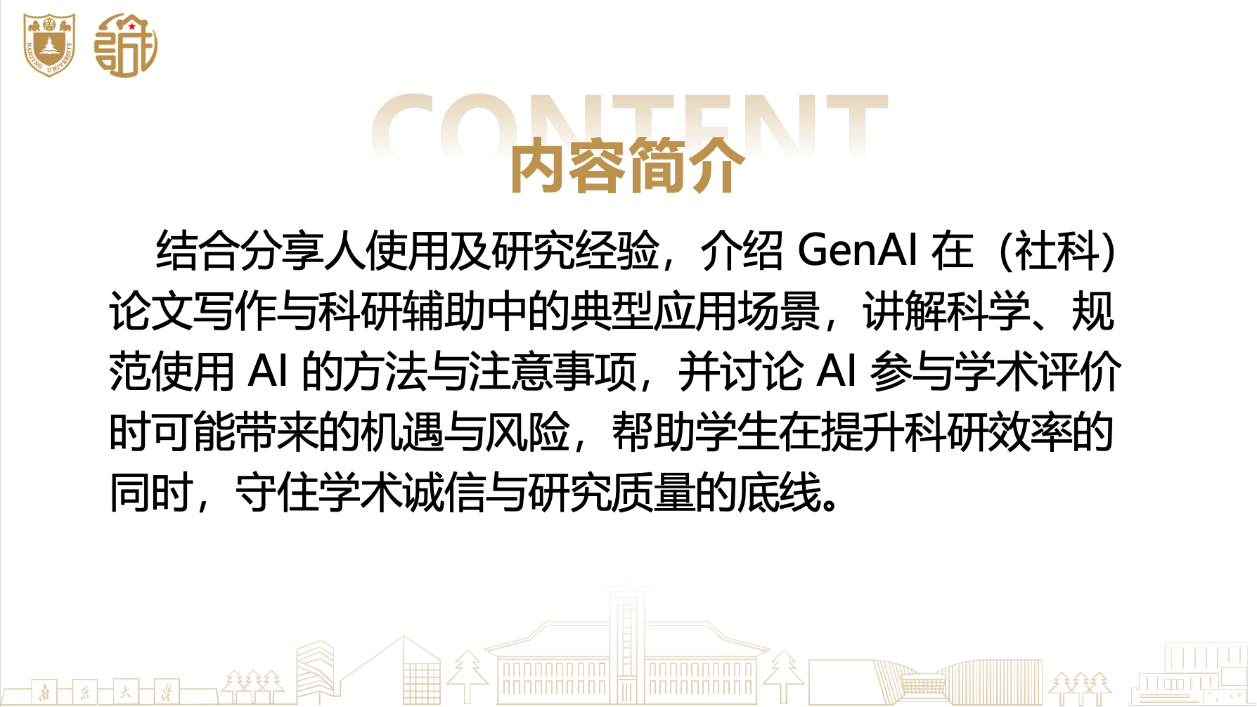 生成式人工智能(GenAI)正日益融入学术研究全过程。本次分享将结合分享人使用及研究经验,介绍 GenAI 在论文写作与科研辅助中的典型应用场景,讲解科学、规范使用 AI 的方法与注意事项,并讨论 AI 参与学术评价时可能带来的机遇与风险,帮助学生在提升科研效率的同时,守住学术诚信与研究质量的底线。