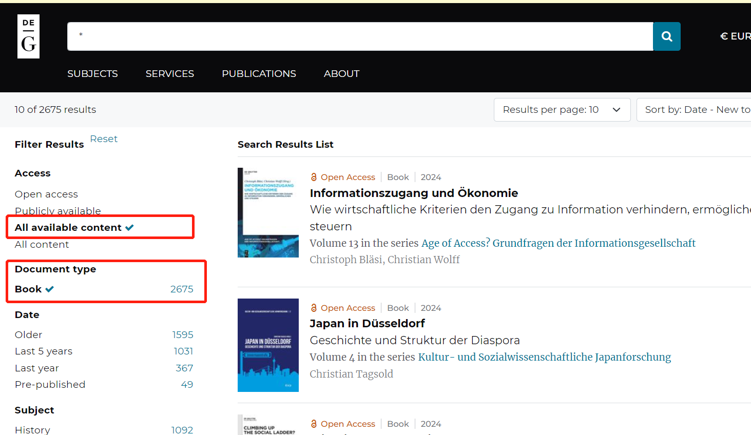 在主页检索框输入任意关键词检索以后,选择左侧筛选功能Access下面的“All available content”和“Document type”下面的Book即可获取相关拥有全文下载权限的图书。